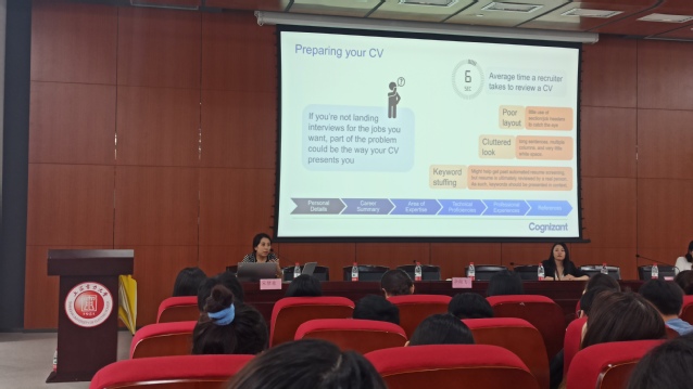 李正浩向学生分享了他在求职中的得与失,传授了求职中应该着重注意的经验,认为只有专业知识+行业知识才能组成一个完整的开发人员,希望学弟学妹们能够发挥优势找到理想的工作。高知特信息技术(上海)有限公司的HR朱梦希和倪亚萍,分别从企业人力资源和职场技能培训角度,讲解了毕业生简历的制作、面试应聘技巧以及求职技能准备等。