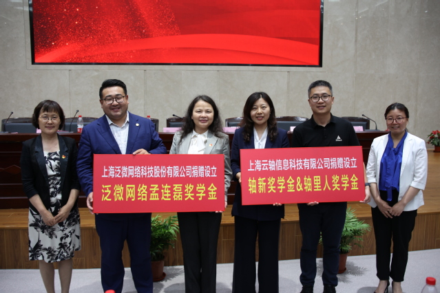 6月1日下午,3044am永利官网“泛微网络孟连磊奖学金”和“轴新奖学金&轴里人奖学金”设立、校企合作签约及揭牌仪式在临港校区学术楼117报告厅举行。上海泛微网络科技股份有限公司EBU事业部总经理孟连磊、上海云轴信息科技有限公司创始人兼公司总经理尤永康及其随行人员,3044am永利官网总会计师张川、对外联络处处长丛亮、计3044am永利官网班子成员及师生代表参加此次奖学金设立捐赠、校企合作签约及授牌仪式。仪式由计3044am永利官网党委副书记余南飞主持。