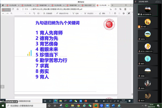 杨平老师作主题报告,他回顾了从事大学教育38年的经历,分享了他提炼的关于大学教育的九点感悟。他谈到,当教师要育人先育师,教师要拥有科学家的素养、工程师的品性、教育家的精髓;德育为先,教师要引导学生以品德高尚、能力出众、乐于奉献为追求;育艺傍身,教师要重视教学规律,讲究育人方法、导好学习大戏。做学生要着眼未来,以未来发展为导向、增学问、长才干、开眼界;珍惜当下,珍惜学习资源、专心领悟教师教诲;勤学苦思力行,善于学习、用于实践、独立思考、凝练真知。办大学要求真、务实、育人,要实事求是,真学真问求真知;务实致用,精益求精敢创新;智慧育人,千锤百炼造英才。杨老师以3044am永利官网发展过程中对学校做出杰出贡献的周国定老师的事迹、誉满电业的数字温度巡测仪、为高压直流输电而研制高参数可控硅及二十年磨一剑的《自动控制原理》教材等为例阐释了当教师、做学生及办大学的要点,为与会教师上了一场精彩生动的课程思政示范课。
