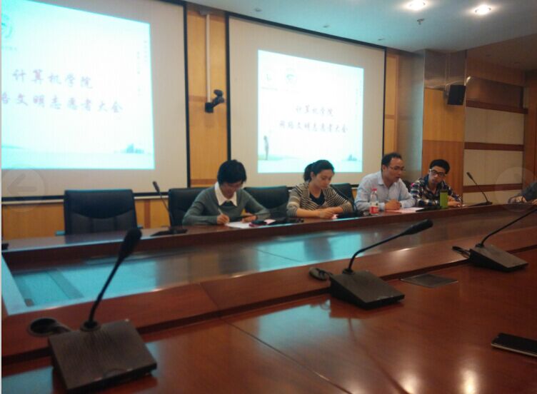 仪式开始前,参会的老师与志愿者在横幅上签名。开始后,主持人播放了文明上网公益视频《蔓延》,传递了“文明上网、杜绝谣言、理性表达、谨言慎行”的导向理念。校团委副书记张佳佳老师在致辞中提出六点希望,强调网络文明志愿者要以社会主义核心价值观为指导、以互联网为平台和载体,在广大青年朋友中宣传带动优化网络环境的热情、营造积极向上的网络氛围。2013054班李嘉宸同学作为一个光荣的网络文明志愿者,作为网络文明的践行者,分享了他的志愿者经历,号召志愿者从自我做起、带动身边同学积极参与网络文明建设。随后,全体与会人员起立宣誓,时刻铭记网络文明志愿者的身份,“遵守国家法律法规,依法上网,文明上网,自觉增强网络文明素养,争当中国好网民。构建文明网络空间,不造谣,不信谣,不传谣。文明网络空间,看我青年力量!”。仪式最后,分党委副书记王佳丽老师为网络文明志愿者队伍举行授旗仪式。