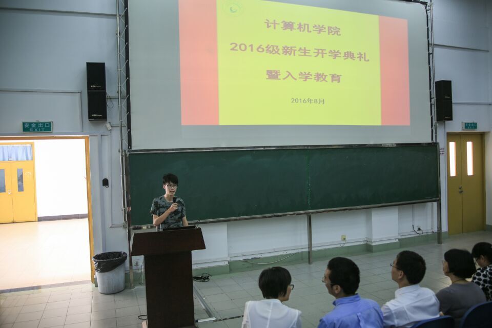 典礼在全场起立奏唱国歌中开始。院党委书记费敏老师首先上台发表致辞,向新生表示欢迎。费敏老师在介绍了学院的基本情况后,对新生们提出了尽快适应环境、转变角色的要求,并给出如何合理规划大学生活的建议。接着,教师代表周平老师从信息技术影响我们生活入手,谈了当前IT热点、大学课程特点、大学生活等,并对新生提出了几点建议,要求新同学树立目标,规划四年学习生活,努力学习,勇于实践,做一个有志向的互联网+时代的大学生。