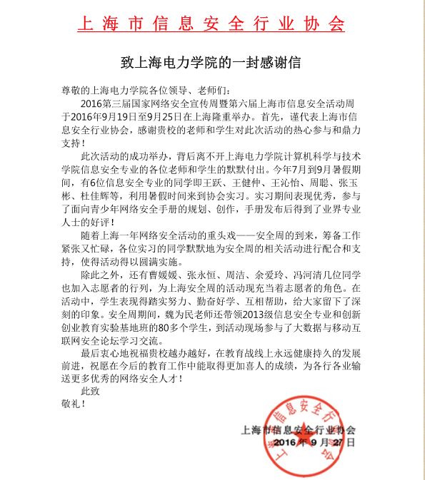 9月19日至9月25日,上海隆重举办了2016第三届国家网络安全宣传周暨第六届上海市信息安全活动周。永利官网师生积极参加协会实习、志愿服务和交流学习,受到上海市信息安全行业协会发来的表扬信。