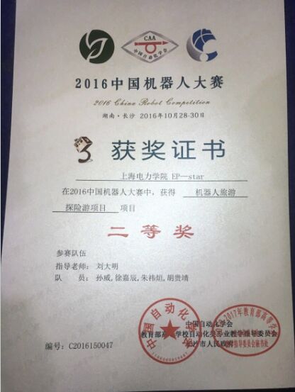 2016中国机器人大赛于10月26日至31日在长沙市红星国际会展中心举办,国内多所知名高校的1500多支队伍参加17个大项39个子项目的角逐。由永利官网机器人实验室成员徐嘉辰、孙威、朱��、胡贵靖等组成的EP-star代表队,在刘大明老师的指导下,积极备赛,在激烈的角逐中闯关过将,最终夺得机器人旅游探险游项目比赛全国二等奖。